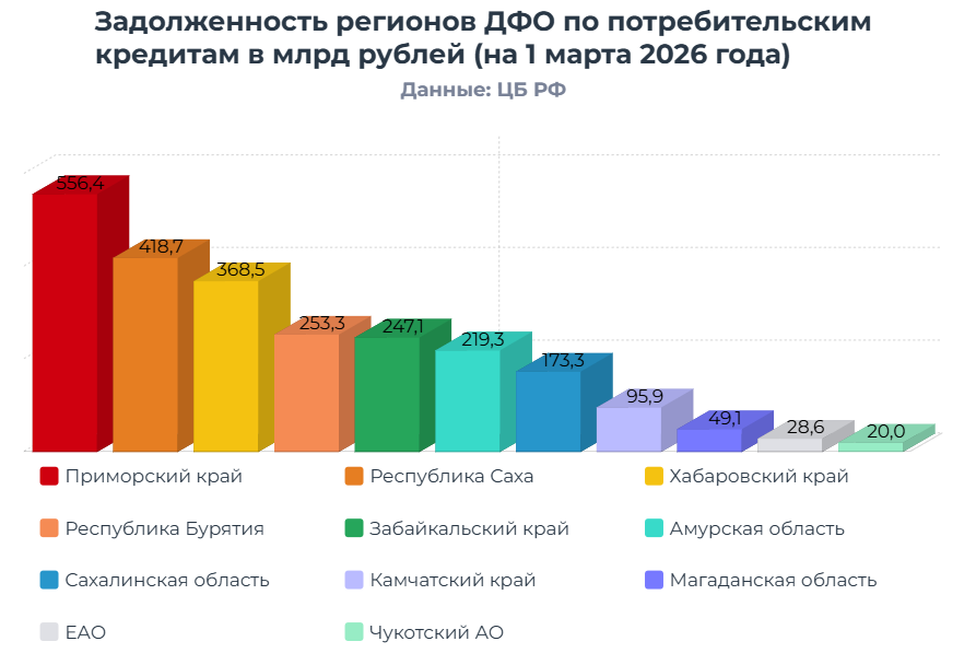 К 1 марта 2026 года самыми активными заемщиками на Дальнем Востоке оказались жители Приморского края. Банки выдали им потребительские кредиты на общую сумму 556,417 млрд рублей. На втором месте оказалась Якутия (418,65 млрд рублей), замыкает тройку Хабаровский край (368,53 млрд рублей). Остальные регионы ДФО, по оценкам Центробанка РФ, отличились следующими показателями задолженности: