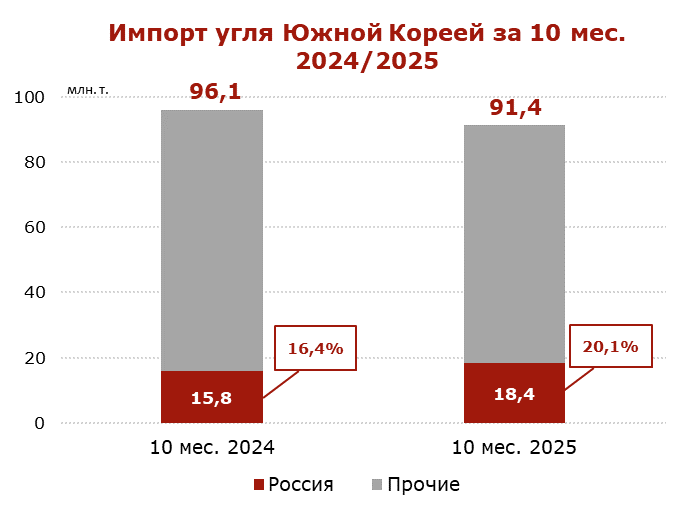 Индекс южноафриканского угля 6000 подскочил до 90-91 долл./т., продолжая укрепляться 5 недель подряд на фоне улучшения спроса со стороны Вьетнама и Южной Кореи. Кроме того, запасы на терминале RBCT сократились до 3.69 млн т. (-0.06 млн т. к 19.11.2025 г.).