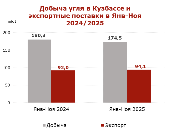 В Кузбассе, где сосредоточено производство высококачественного угля, добыча в январе-октябре 2025 г. упала до 157.6 млн т. (-6.1 млн т. или -3.7% к январю-октябрю 2024 г.). Массовые проверки безопасности на шахтах и угольных разрезах, инициированные Ростехнадзором в 2022 г., после взрыва на шахте Листвяжная (СДС), продолжились в 2023–2025 гг., что приводит к приостановке деятельности ряда шахт и разрезов, а также ограничивает предложение высококалорийного материала и угля PCI на мировом рынке.