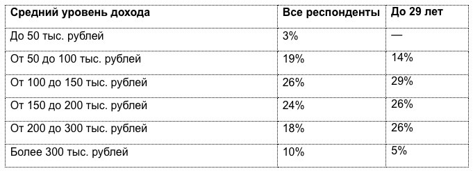 Что касается ожиданий по доходу, 29% молодых участников опроса ориентируются на зарплату в диапазоне от 100 до 150 тыс. рублей. Ещё по 26% рассчитывают зарабатывать от 150 до 200 тыс. рублей и от 200 до 300 тыс. рублей соответственно. Около 5% респондентов надеются на доход выше 300 тыс. рублей. В то же время на заработок ниже 100 тыс. рублей готовы согласиться 14% опрошенных в возрасте до 29 лет, тогда как в общей выборке этот показатель составляет 22%.
