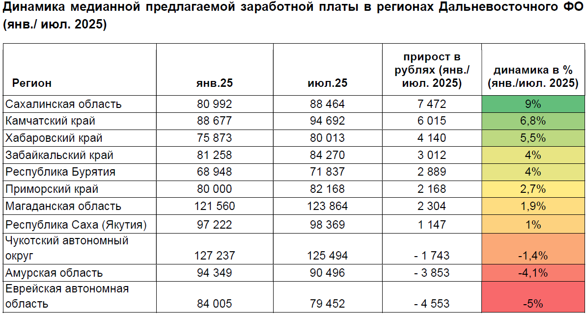 Наибольший рост зарплатных предложений среди дальневосточных регионов зафиксирован в Сахалинской области — на 9% (7 472 рубля), что превышает среднероссийские показатели. Выше средних по ДФО темпов оказались Камчатский край (+6,8%, или 6 015 руб.) и Хабаровский край (+5,5%, или 4 140 руб.).