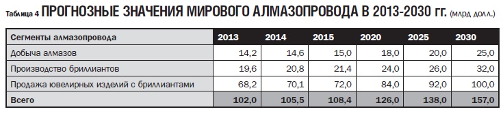 Согласно прогнозируемым автором показателям алмазопровода, стоимость добытых алмазов к 2030 году возрастет почти в два раза, в то время как стоимость произведенных бриллиантов и объем продаж ювелирных изделий с бриллиантами - всего на две трети.