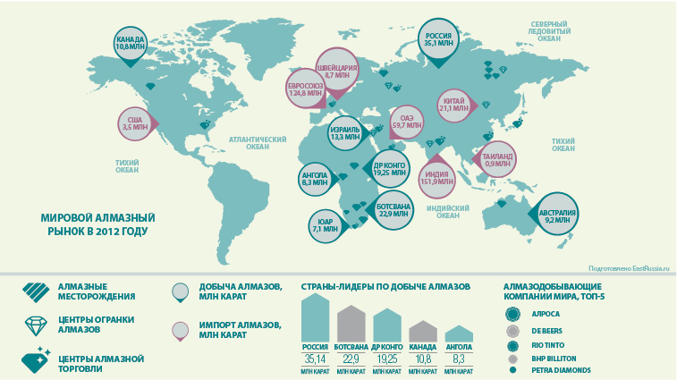 Мировой экономический кризис 2008-2010 гг. кардинально изменил сложившиеся в докризисное время балансы между добывающими, гранильными и торгующими алмазной продукцией предприятиями. Конкуренция между ними в этих условиях резко обострилась. Снижение спроса на бриллианты и ювелирные изделия с бриллиантами в 2010 году привело к изменению пропорций между секторами алмазного бизнеса, и показатели мирового алмазопровода-2012 отличаются от предшествующего.