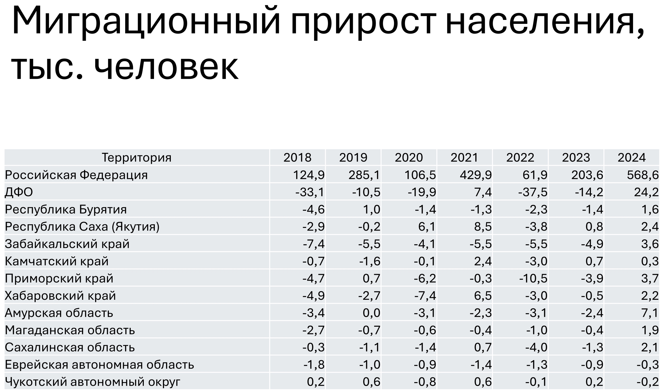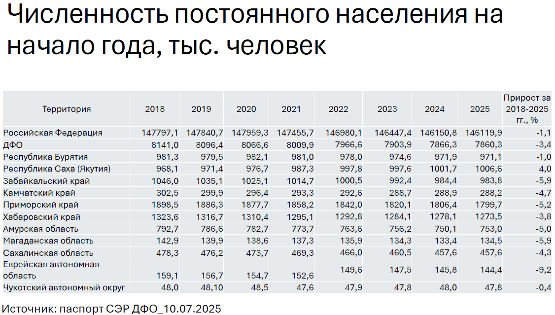 В том числе в Приморском крае население за минувший год уменьшилось на 12,5 тыс. человек – до 1,807 млн. В Забайкальском крае снижение составило 8 тыс. человек – до 984,3 тыс. человек. В Хабаровском крае жителей стало меньше на 4,8 тыс. человек – до 1,281 млн. Население Амурской области уменьшилось на 4,6 тыс. человек – до 751,5 тыс. человек, Бурятии – на 1,3 тыс. человек (до 971,8 тыс. человек), Сахалинской области – на 1,2 тыс. человек (до 458 тыс.), Еврейской АО – на 1,6 человек (до 146,6 тыс. чел.). На 996 человек стало меньше жителей Магаданской области (до 133,3 тыс.).