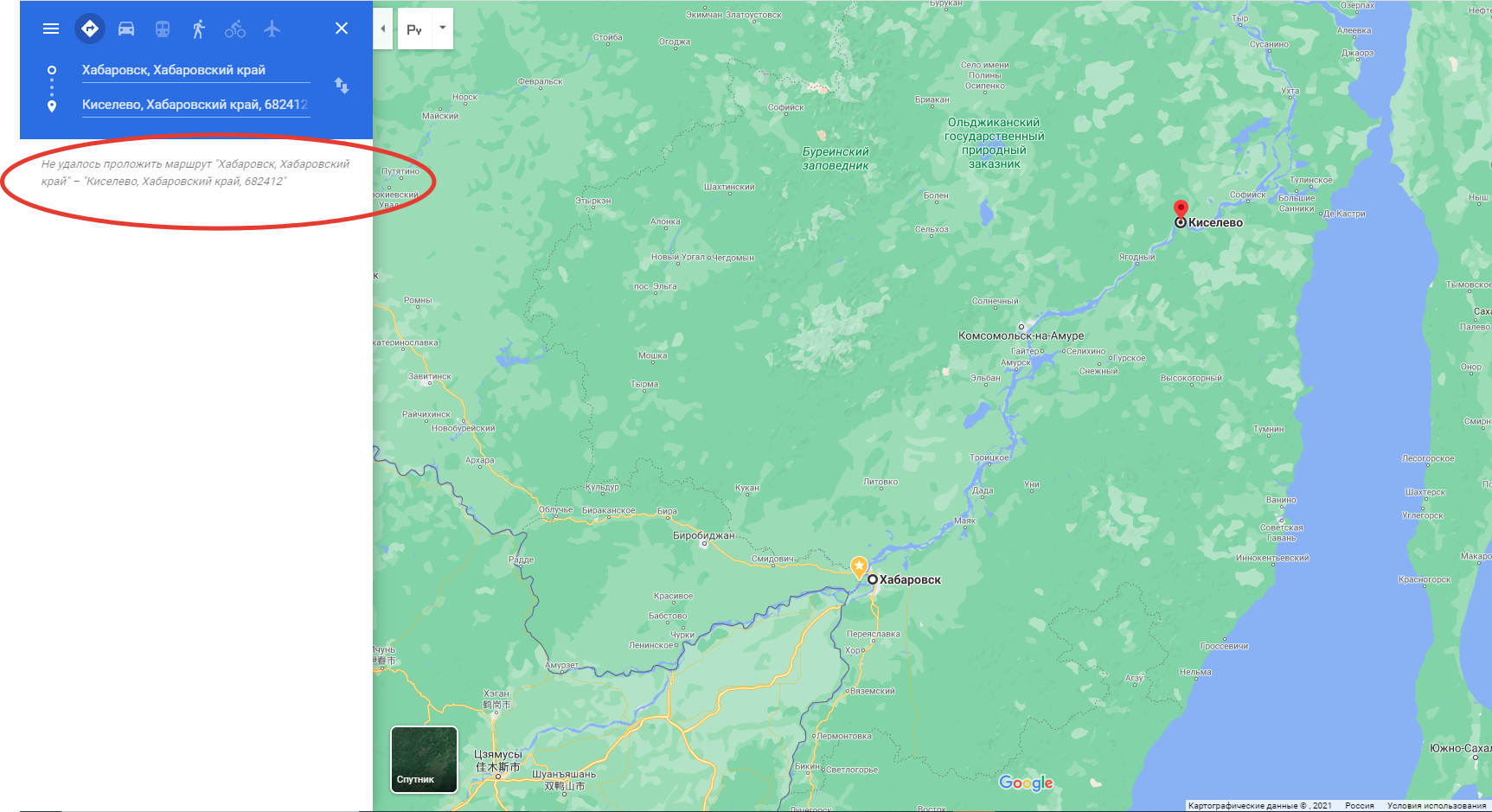 Почти маршрут. Тут видно, что Киселевка и Комсомольск-на-Амуре на одном берегу Амура находятся, но дороги между ними нет.