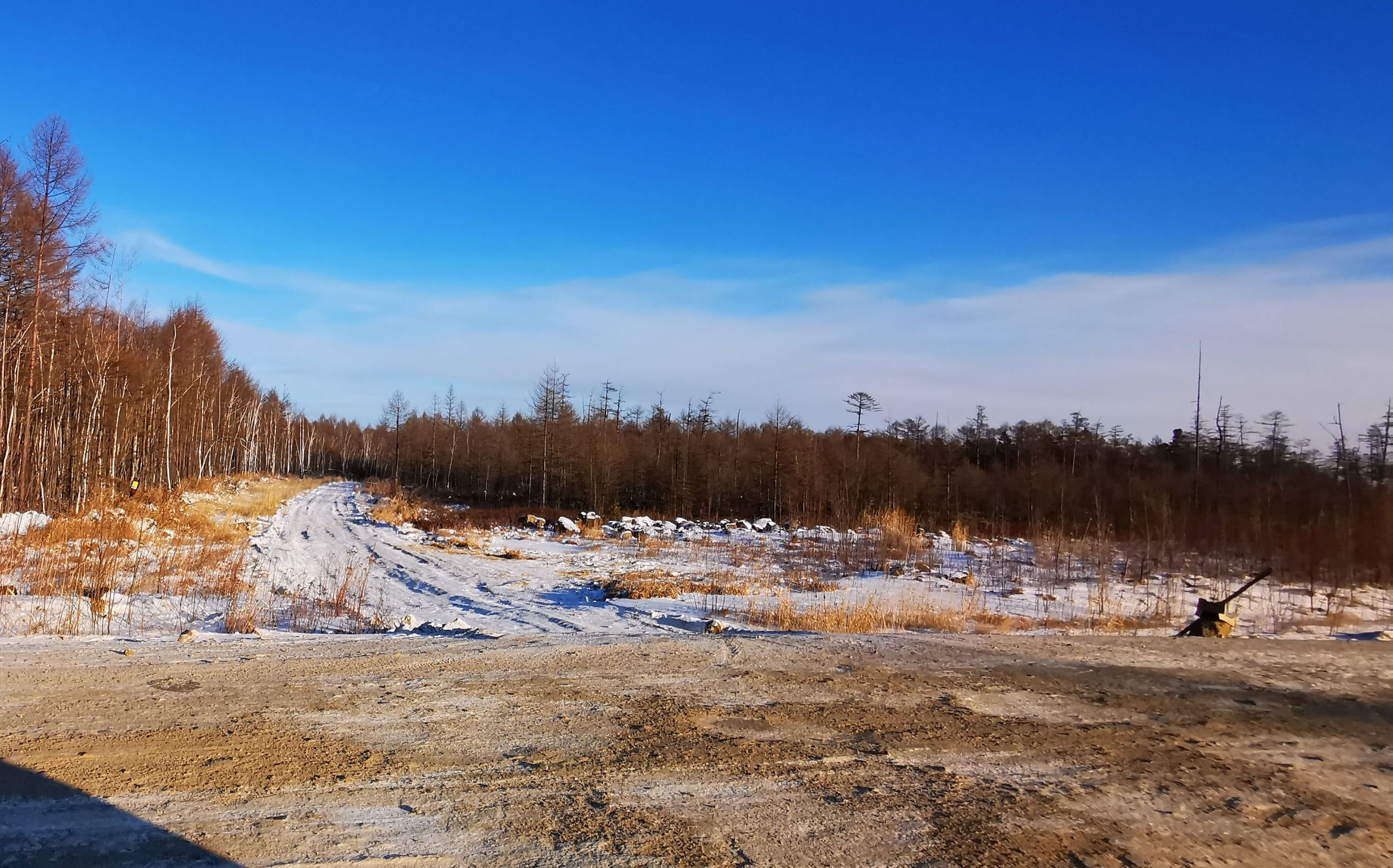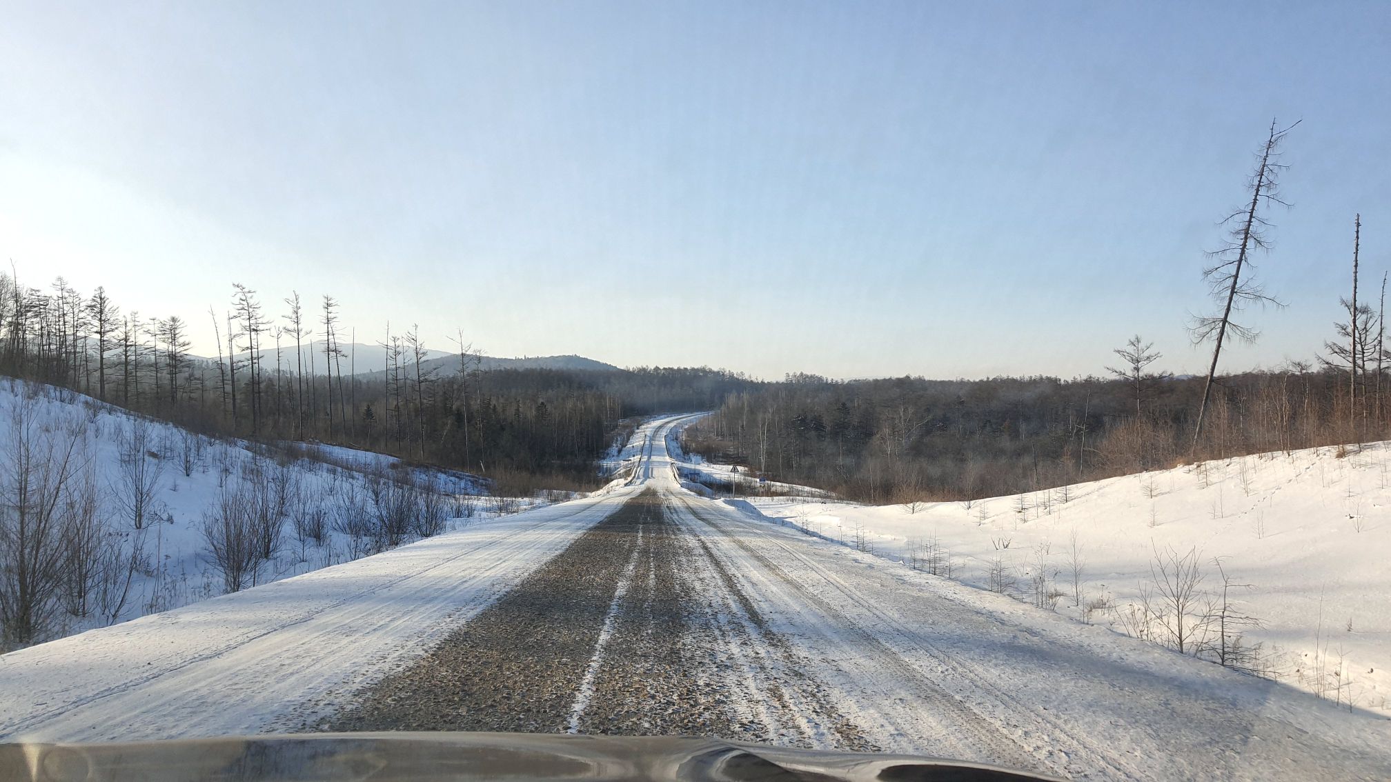 Подъем не сильно ранний: ехать в зимних утренних сумерках – только зазря уставать. Наша главная задача проскочить самую легкую часть пути так, чтобы успеть засветло преодолеть километров 13 по замерзшей мари и переправиться через сам Амур - это еще километров семь вдоль берега, и, собственно, через реку. Легкая часть это асфальтированный отрезок трассы Хабаровск – Комсомольск-на-Амуре – 340 км до поворота на так называемую «николаевскую» трассу Селихино – Николаевск-на-Амуре. Как некогда (пару лет всего назад) объяснял мне руководитель местного «Крайдор»-предприятия, этой дороги вовсе нет. Ну, она как бы есть, но как бы и не совсем. Потому что родилась она когда-то стихийно – из разрозненных лесовозных троп, которые постепенно соединились и протянулись вдоль Амура аж на гордые почти 600 км. Вот по этой некогда лесовозной, но сейчас даже временами обустраиваемой грунтовке, которая местами переходит в скальник, нам надо проехать еще километров 160-170, и, не доезжая совсем немного до села Циммермановка, с нее решительно свернуть и см. выше – преодолеть марь и пересечь Амур. Что такое марь? Это такой рельеф болотный, на котором есть и кочки, и лес встречается, и поляны, такое себе… добротное бездорожье.