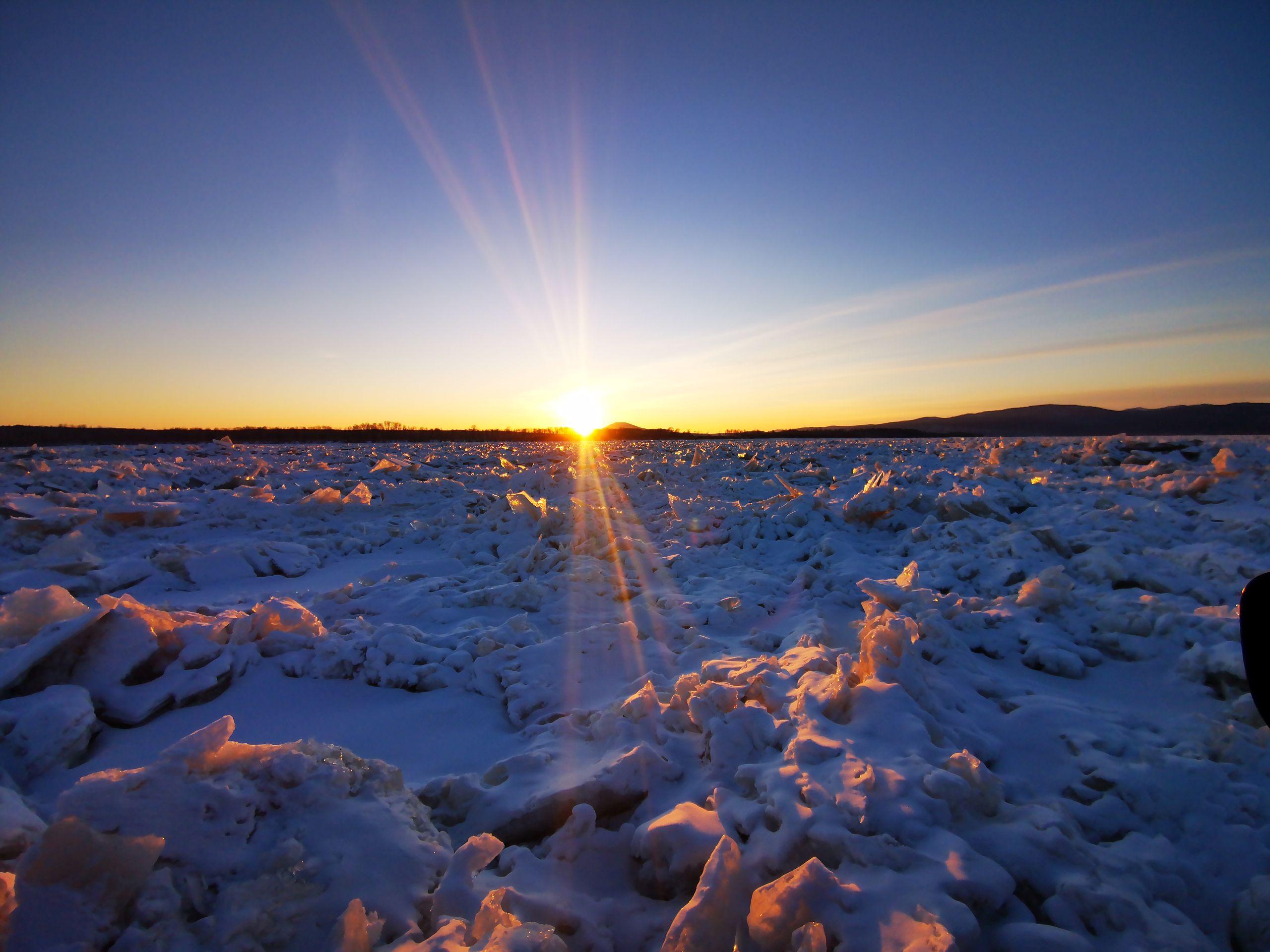 Читать не надоело? А ведь это же мы еще до Амура не доехали! Но будем считать, что доехали – спустя час шкандыбания по пресловутой колейной мари мы оказались на берегу и тронулись сначала вдоль берега. И хотя колея осталась позади, спокойствия вовсе не прибавилось. Снега в этом году было немного и хорошо читаемых следов поэтому мало, а любой неправильный поворот и выезд на лед чреват плутанием в торосах, с отсутствием возможности развернуться, и потерей времени. А на часах уже около четырех, и хотя еще светло, но солнце уже намекает на скорое расставание.
