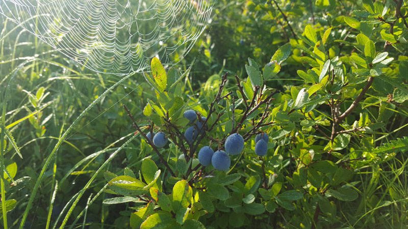 Спустя полтора часа мы на месте. Здесь уже припаркованы несколько машин, все здешние. Заря не проливает свет на нашу локацию – без опытных проводников дорогу к ягоде не найти. Перед выходом на рабочие места сборщики переоблачаются: резиновые сапоги на ноги, закрытая одежда и защита для лица и головы, такой дресскод диктуют заболоченная местность и гнус. Марь начинается уже в полусотне метров от обочины. Мы застаем её в пелене густого тумана, янтарно подсвеченного первыми рассветными лучами. Наши проводники уверенно ныряют в дымку и один за другим растворяются на делянах. Туман отползает к лесополосе, шапками сахарной ваты оседая на кустах. Вот она – голубика, вся усыпанная каплями выпавшей росы.