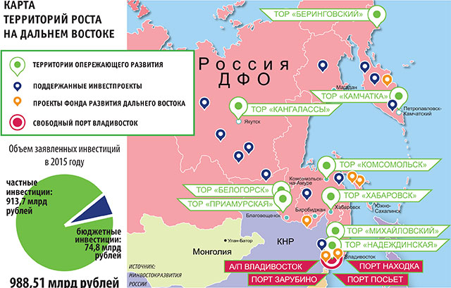 В 2015 году Правительством создан механизм господдержки инвестиционных проектов на Дальнем Востоке. Это предоставление инвесторам субсидий из федерального бюджета на создание необходимой им инфраструктуры. За год мы уже дважды проводили отбор инвестпроектов на получение данной меры поддержки. Итог первого тура – 6 проектов: господдержка – 13,8 млрд рублей, частные инвестиции – свыше 126 млрд рублей. Итог второго тура – еще 6 проектов, господдержка – 31 млрд рублей, объем частных вложений – 365,74 млрд рублей.