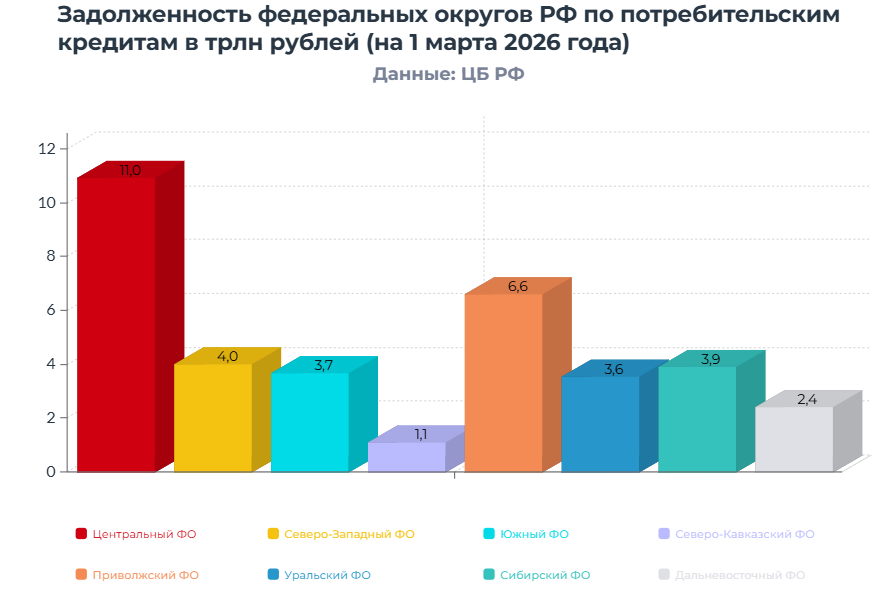 Самый большой вклад в задолженность россиян по потребительским кредитам стабильно вносит Центральный федеральный округ — 10,95 трлн рублей на 1 марта 2026 года, что составляет чуть меньше 30% от общей суммы. Самый низкий показатель по кредитным обязательствам — у населения регионов Северного Кавказа (1,11 трлн рублей). Объем потребительских займов в Дальневосточном федеральном округе вдвое выше и составляет 2,43 трлн рублей, но на фоне данных остальных макрорегионов выглядит одним из самых скромных.