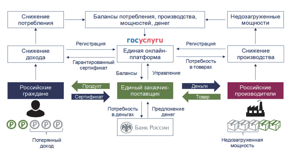По мнению авторов публикации, гарантированный сертификат может и должен работать прозрачно и без инфляционных рисков. Для этого сам сертификат должен быть индивидуальным и неотчуждаемым, потратить его можно только владельцу и только на продукцию отечественного производства. Управление закупками будет производиться централизованно, единым заказчиком-поставщиком, что позволит обеспечить промышленность крупными заказами и добиться дисконта к рыночной цене. Финансировать модель предложено Центральному банку РФ за счет целевой эмиссии в размере денежной массы, фактически уже обслуживавшей до кризиса упавшее потребление и производство. Такой подход позволит избежать инфляционных рисков и сконцентрировать усилия на поддержке отечественного производителя.