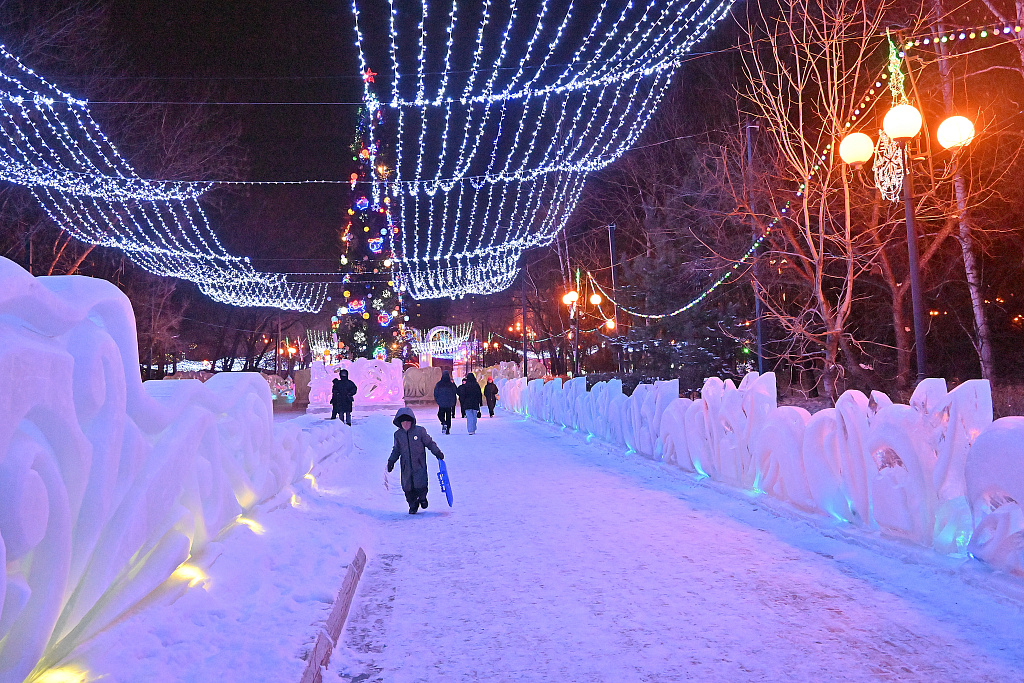 Как рассказали EastRussia в администрации города, в этом году парк сияет ярче прежнего, гирлянд стало еще больше, а камзол знаменитого Гулливера украсили светодиодами. Кроме елки на главной аллее в парке можно полюбоваться работами участников традиционного конкурса ледовых скульптур «Амурский хрусталь».