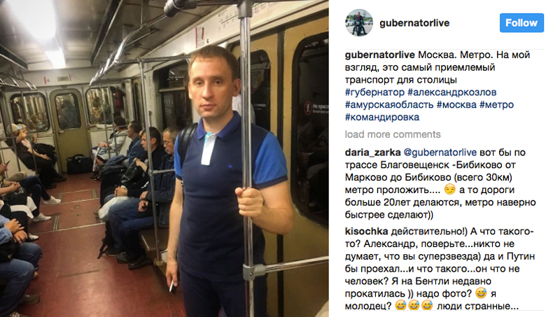 Губернатор Амурской области Александр Козлов взорвал соцсети, опубликовав в инстаграме фотографию из московского метро. Фото с описанием "Москва. Метро. На мой взгляд, это самый приемлемый транспорт для столицы” собрало свыше 2 тысяч лайков и три десятка комментариев. В области задумались о том, куда и откуда ехал губернатор – вагон явно полупустой, значит снято, вероятно, либо в выходной, либо в глубоко вечернее время. Губернатор одет в стиле casual, но на фото не улыбается и не выглядит расслабленным. Учитывая, что в день публикации Александр Александрович уже открывал соревнования по драг-рейсингу в Благовещенске, публикация выглядит как домашняя заготовка. А учитывая слух №1 в сегодняшнем рейтинге слухов, многие начинают активно мистифицировать, зачем же на самом деле понадобилась такая публикация.