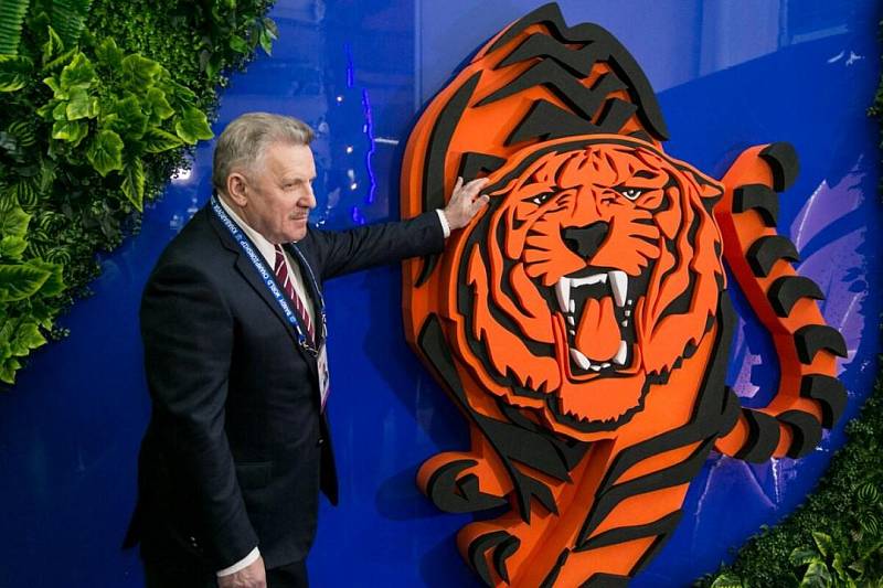 Затем болельщики могут погрузиться в брендбук Чемпионата - пофотографироваться. Например, с выставленными парой над мячом клюшками, держась за которые, человек походит на гребца в лодке ("Это по Анюю, Вячеслав Иванович, как будто идете", - шутил Александр Федосов, пока губернатор фотографировался), с настенным изображением оскалившегося тигра, макетом лотоса, с гигантскими мячом, коньком или клюшкой.