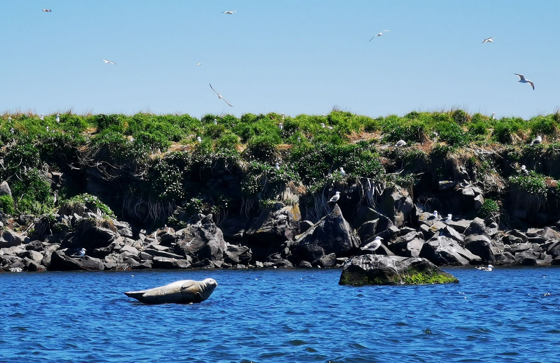 Но не только чайками славен остров Токи. Здесь живет множество ластоногих — Ларги, они же разновидность тюленя, а на вид – эдакие морские коровы. Плывешь на лодке – а они возлежат на камнях, высовывающихся из моря, и кажется, что эта огромная туша покачивается прямо на волнах. Однако близко к себе не подпускают: только приближаешься – ныряют в воду. То и дело вокруг лодки на расстоянии около полусотни метров выныривают забавные усатые морды и глазеют на нас: опасные или нет?