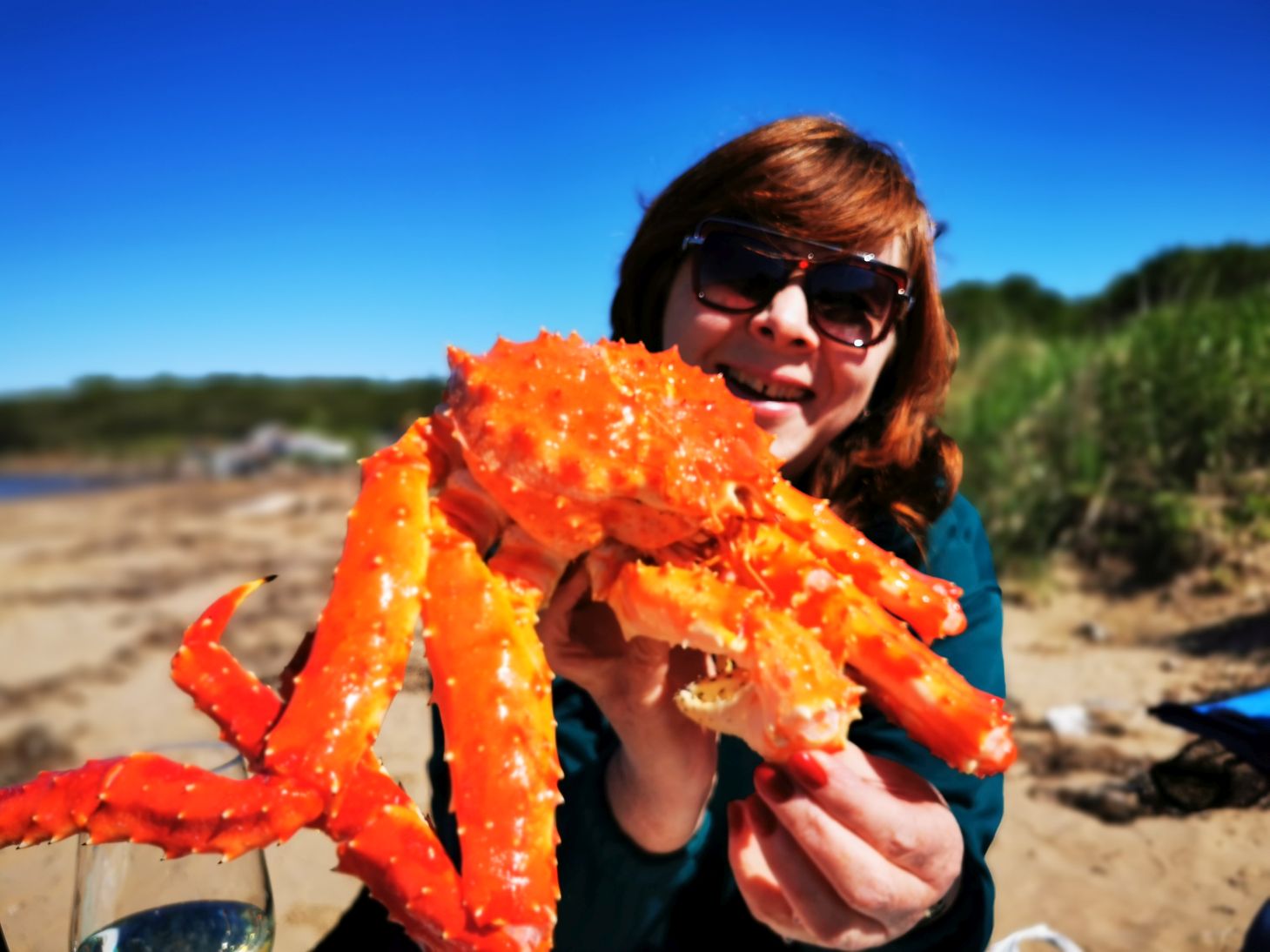 Вернулись на косу, нашли себе неплохое местечко, затаборились там — ииии… Кто не проводил время у моря, подставив лицо солнцу, а на плечи накинув тёплую толстовку, разложив складные стульчики, стол, а на столе – свежий хлеб, овощи и краба, только накануне пойманного и приготовленного по всем правилам, в морской воде – тот не познал рая на земле! Этого краба мы употребили под запотевшую бутылочку новозеландского совиньон-блана.
