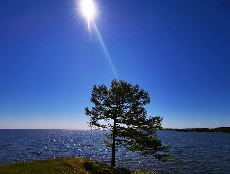 Сначала мы едем по неплохой дороге на север, в сторону Монгохто, а затем сворачиваем с нее, немного трясемся по ухабам, чтобы выехать на живописнейший, как с открытки, высокий берег – с одинокой сосной, широким видом на морской простор и корабль вдалеке.