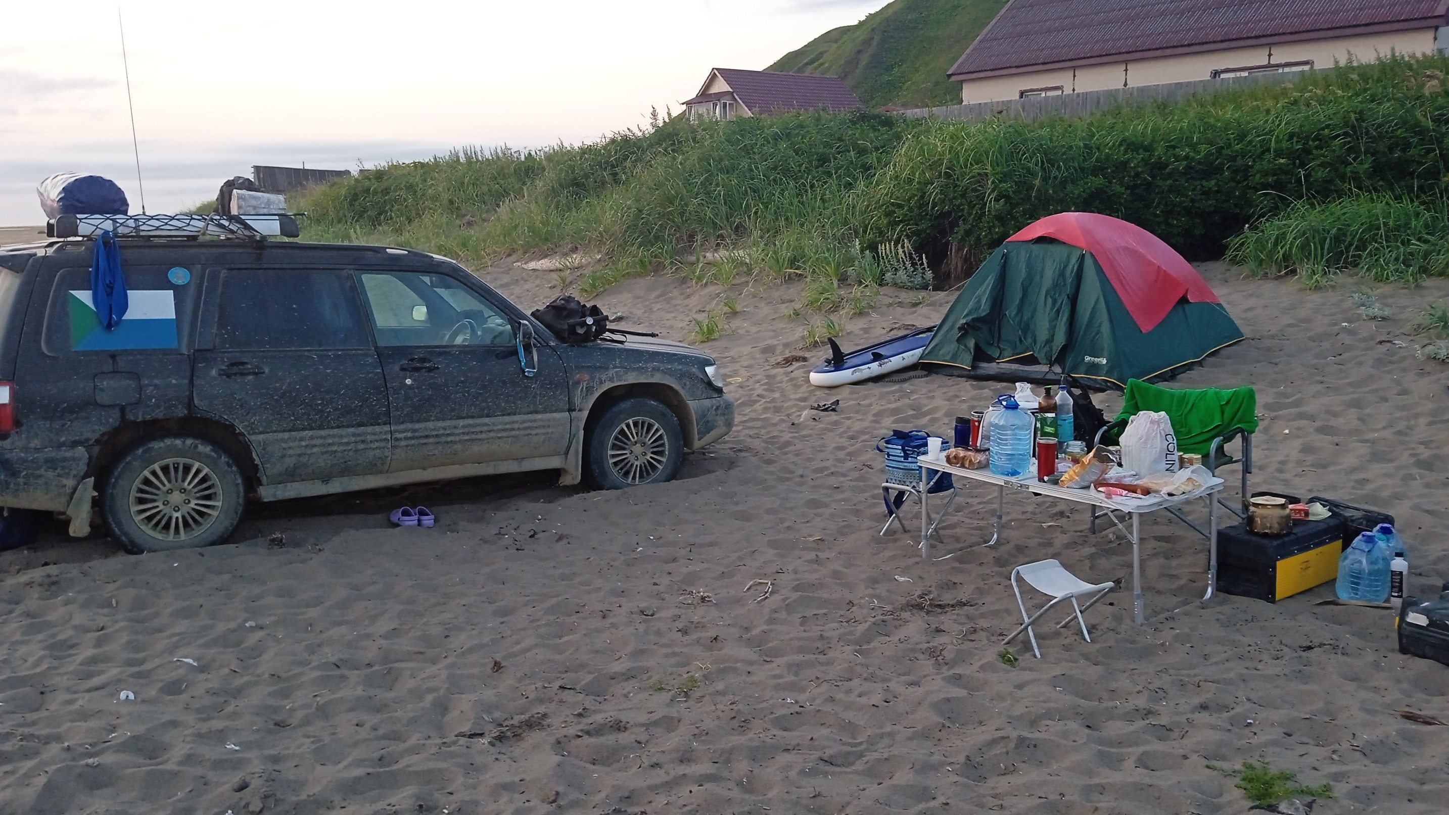 После возвращения и просушки следующим пунктом назначения был мыс Меньшикова. Для этого нам пришлось снова проехать по участку уже «полюбившейся» дороги на Совгавань, но, не доезжая до нее, свернуть в поселок Заветы Ильича, огромным количеством заброшенных зданий и сооружений напомнивший Абхазию. Проехали сквозь него – и выбрались на длинную и узкую песчаную косу.