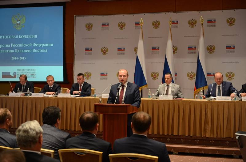 26 июня в Москве прошло второе заседание коллегии министерства развития Дальнего Востока. Собравшиеся подвели итоги работы за период с июня 2014 года по июнь 2015 года, поговорили о создании на Дальнем Востоке территорий опережающего развития (ТОР), о поддержке значимых инвестпроектов и потенциале Свободного порта Владивосток, а также о подготовке к Восточному экономическому форуму.