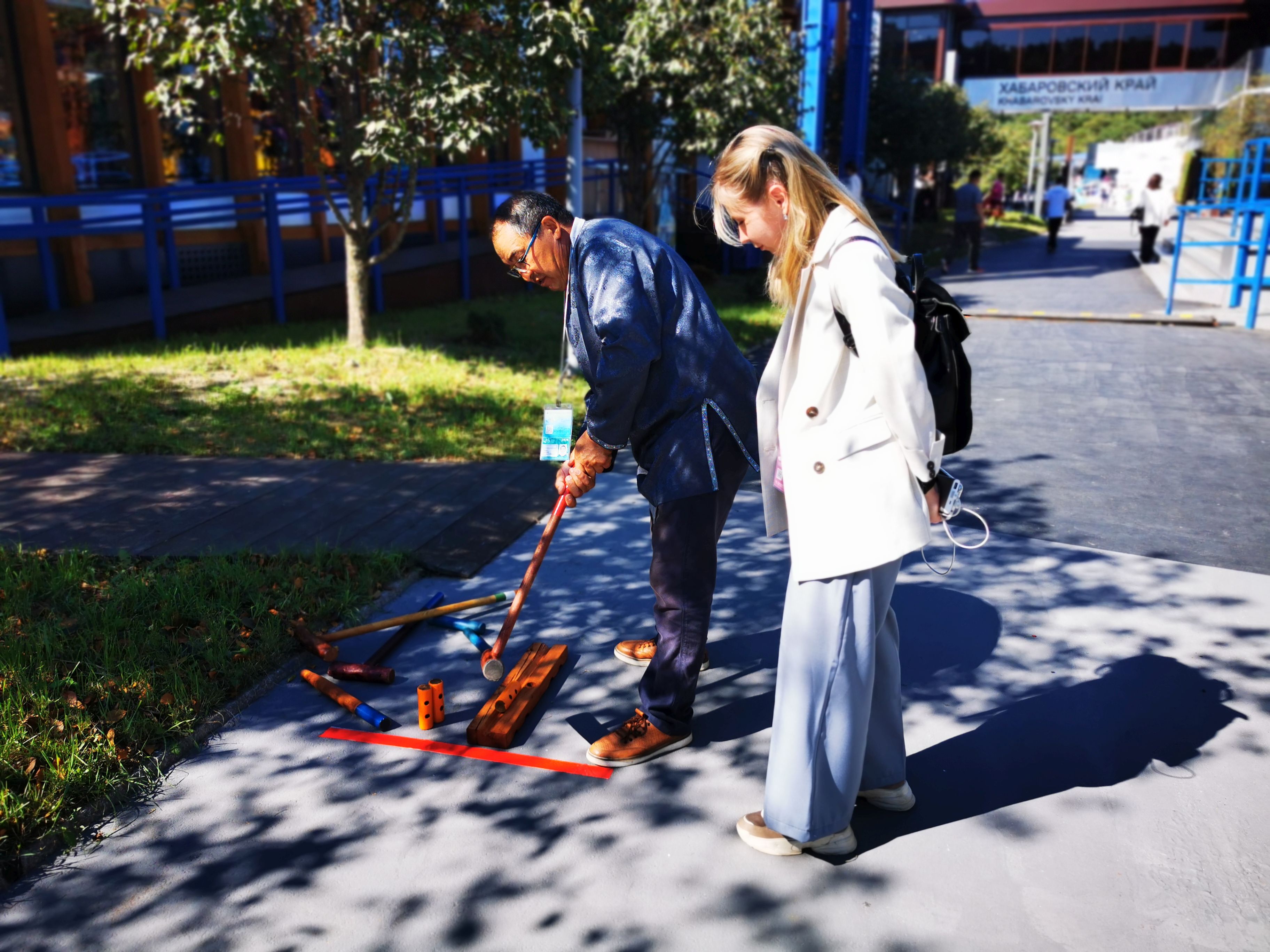 В целом «интерактив» можно считать ключевым словом для описания «начинки» едва ли не каждого регионального павильона. Большие экраны, изогнутые большие экраны, очень большие круговые экраны с подчас замысловатыми способами взаимодействия с ними стали обязательным атрибутом экспозиций. Тем приятнее, когда получается что-то потрогать или увидеть в живую. Например, сыграть в «бурятский гольф»! Не слышали про такой? А он есть. И сыграть в него можно в шаге от камчатского павильона, внезапно оказавшись в мини-Бурятии.