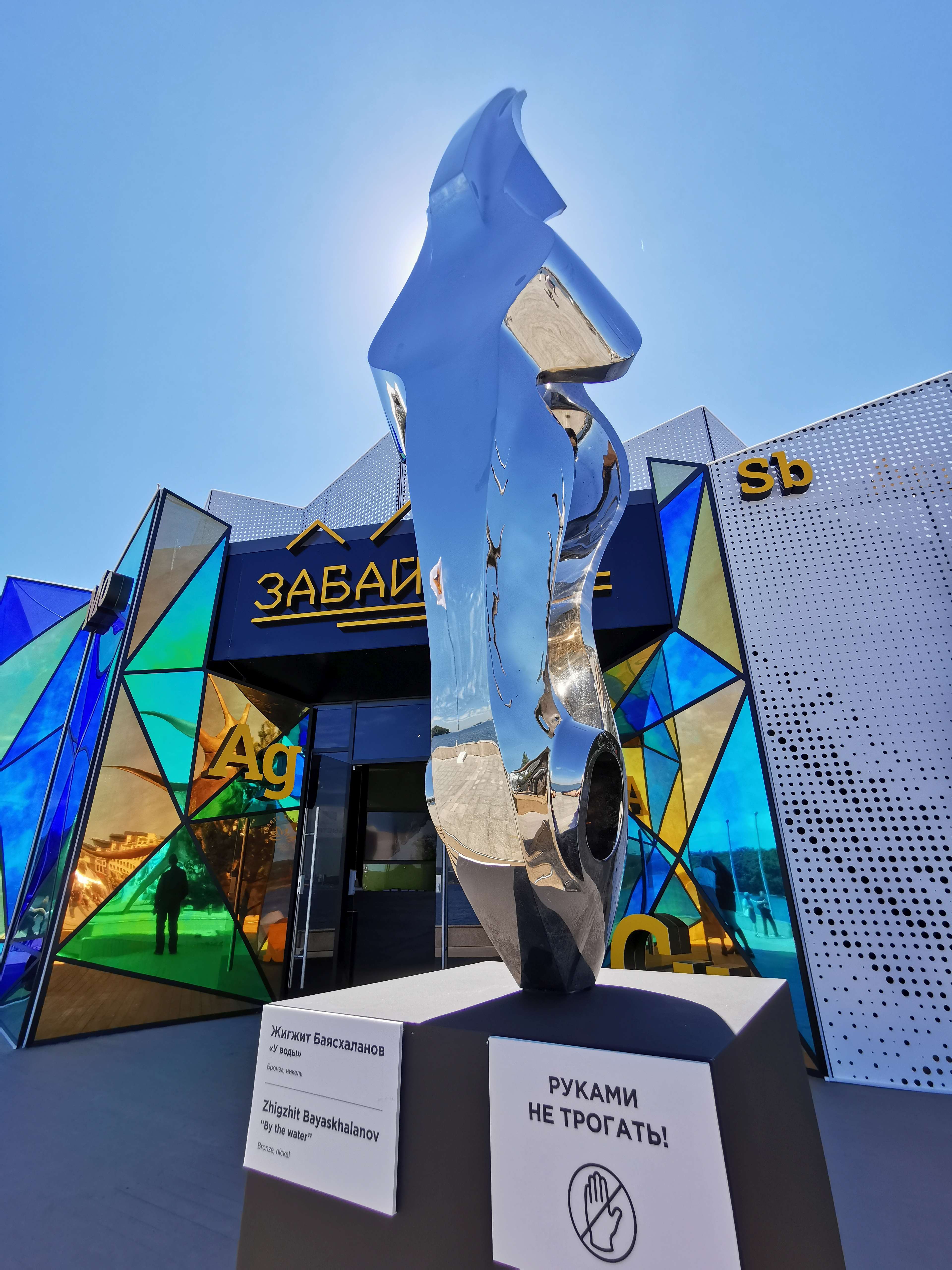 Ещё несколько неспешных шагов и взгляд гуляющей публики притягивает сверкающий арт-объект — скульптура Жигжита Баясхаланова «У воды». Перетекающие линии служат маяком, указывающим путь в шатёр металлургической житницы Дальнего Востока — Забайкалья. Стены павильона испещрены обозначениями химических элементов, которыми богата эта земля. Впрочем, сразу за входом следует продолжение культурного начала — скульптурные композиции из металла, созданные талантом и мастерством Жигжита Баясхаланова и его коллеги по творческому цеху Даши Намдакова.