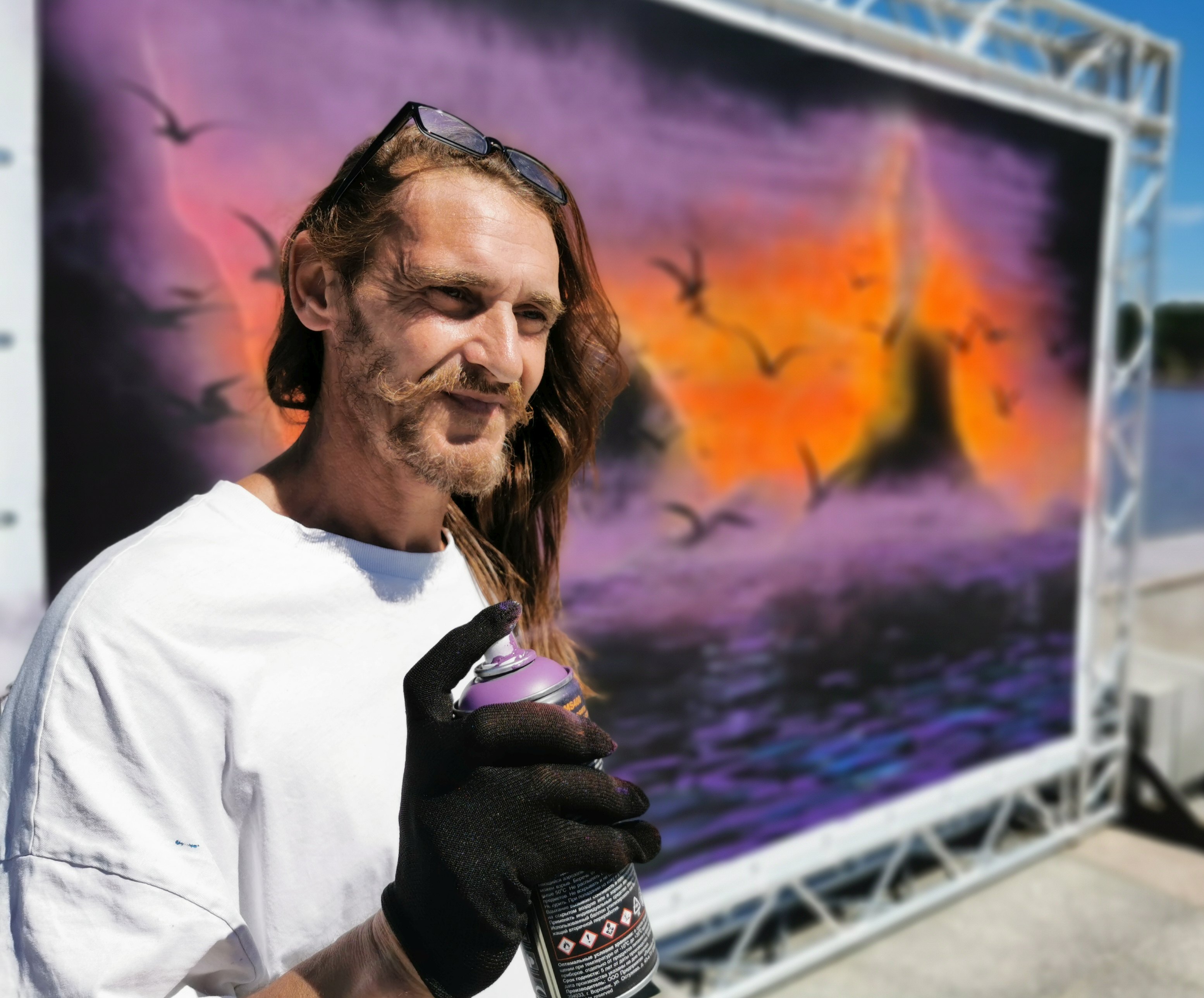 Сделав шаг-другой, гость увидит другое видение этого же маяка — работу кисти, хотя точнее сказать аэрозольных балончиков с краской, сахалинского художника Константина Колупаева. Картины — а их будет несколько — мастер создаёт на глазах у зрителей, некоторым перепадает удача стать соавтором.