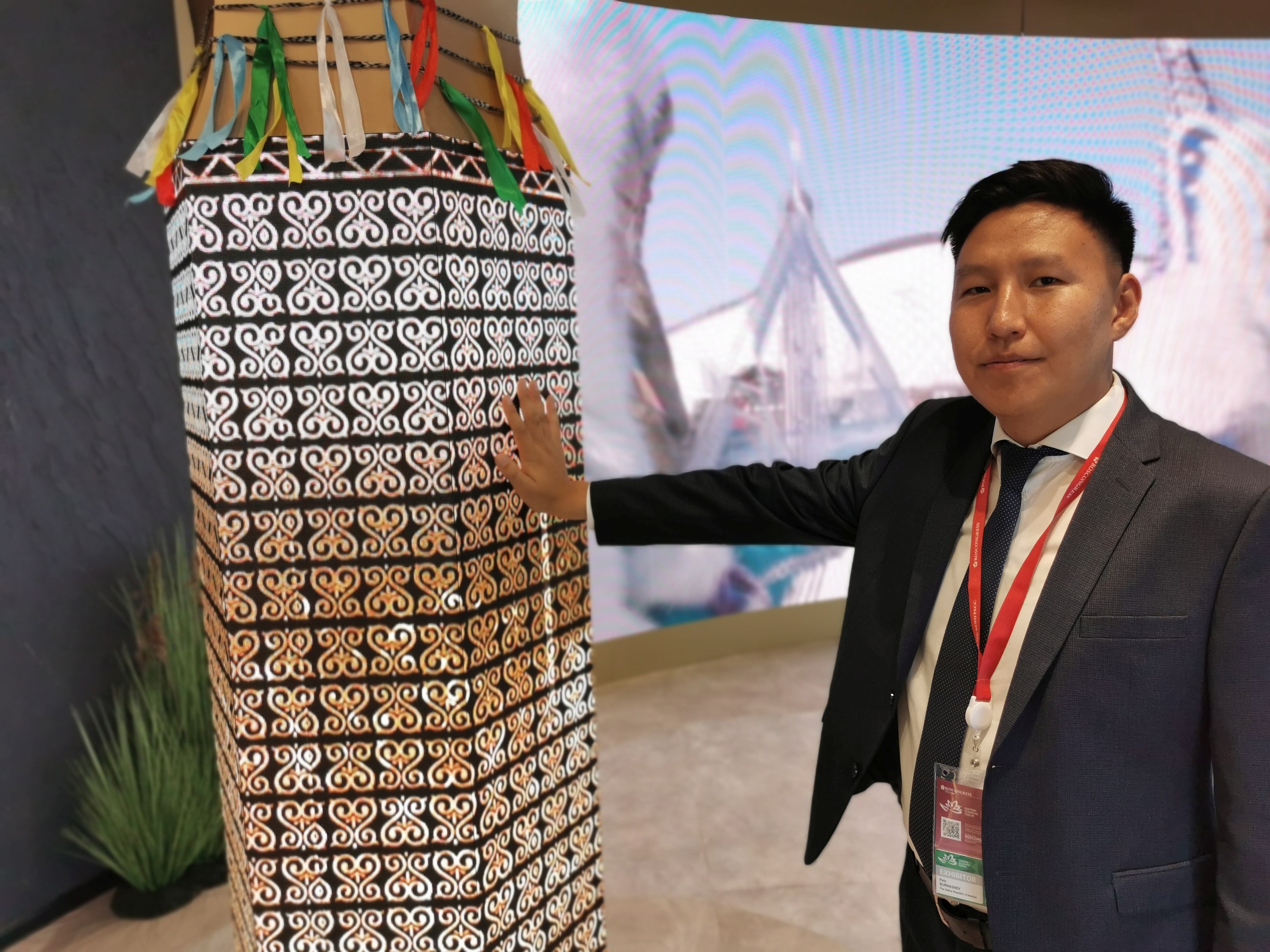 — В этом году наш павильон кардинально поменял свой внутренний облик, — рассказывает Пётр Бурнашев, заместитель постпреда Якутии по ДФО. — Если в прошлом году мы олицетворяли холодную и суровую якутскую зиму, то в этом году павильон оформлен в стиле сухого, жаркого, но короткого якутского лета. В центре павильона вы видите Алтан-Сэргэ, это наше сакральное сооружение — коновязный столб, который использовался для привязки коней с нашими предками. У нас он выполнен в интерактивной форме — когда вы к нему прикасаетесь и загадываете желание, он звучит — раздаются якутские мотивы и ваши желания исполняются.