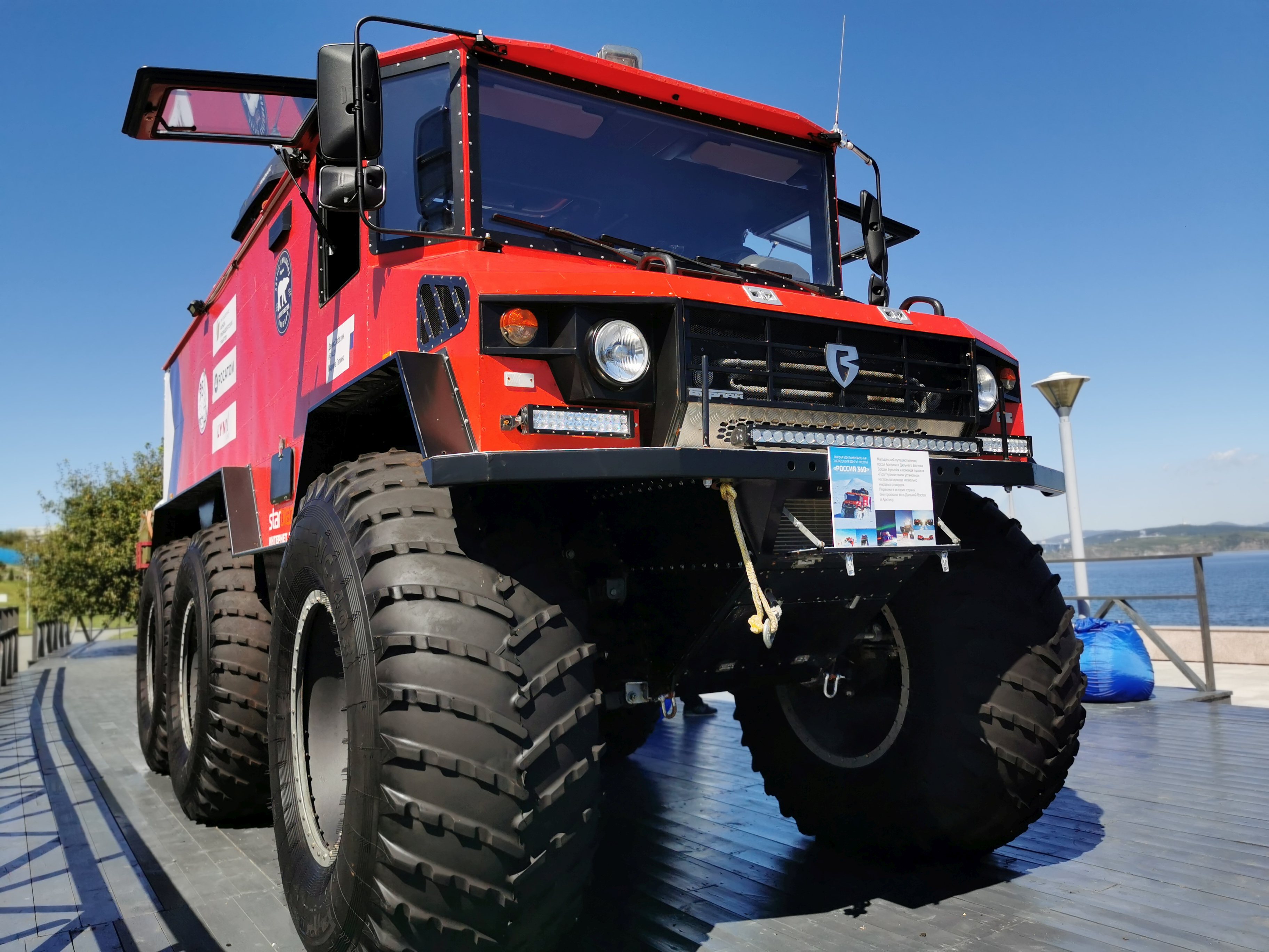 Вот путник подходит к финишу (а может и к началу — это как посмотреть) «Улицы Дальнего Востока» — павильону Магаданской области. Прозрачным намёком на удалённость и труднопроходимость этого региона служит вездеход «Бурлак». На нём экипаж исследователя и путешественника Богдана Булычева за 95 дней преодолел расстояние от Мурманска до Камчатки с заездом на Северный полюс. И это была только первая часть экспедиции «Россия 360», цель которой объехать на колёсном транспорте вдоль всей границы страны.