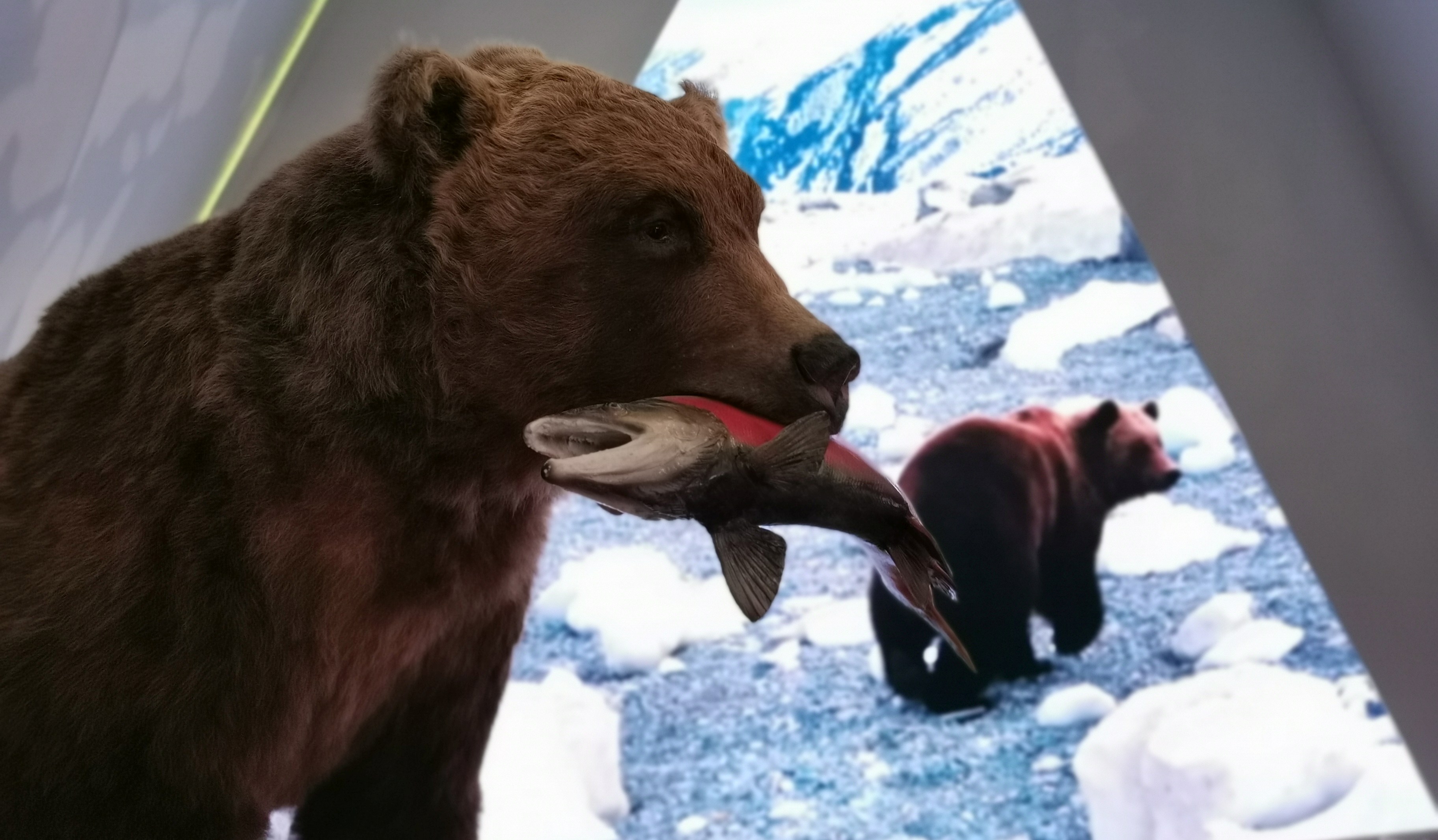 Визуальное оформление сделали тоже максимально натуралистичным, начиная от ковра из тундровой растительности, заканчивая чучелом медведя, вписанного в интерактивный антураж. фото: EastRussia