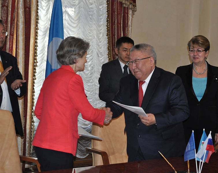 Президент Республики Саха (Якутия) Егор Борисов и генеральный директор ЮНЕСКО Ирина Бокова обменялись мнениями по вопросам участия Якутии в программах ЮНЕСКО и подписали второе коммюнике.