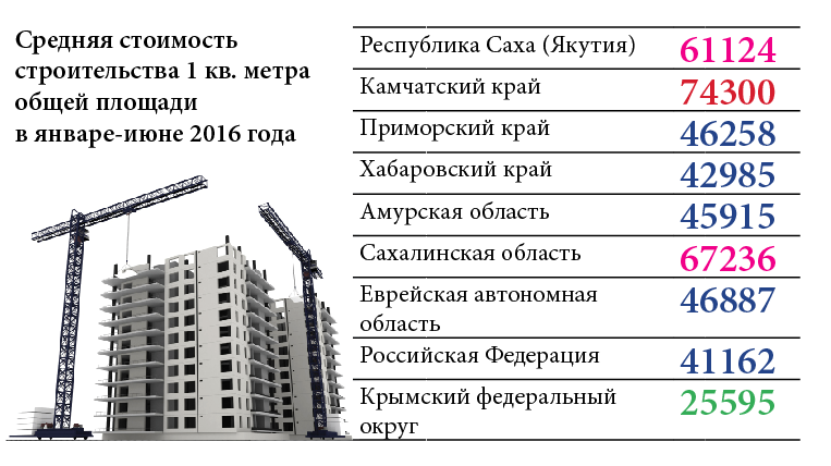 Примечательно, что дороговизну строительства на Дальнем Востоке признает даже государство. Об этом свидетельствует средняя стоимость «квадрата», построенного для решения различных задач социальной политики за счет бюджета (выделение субсидий, обеспечение жильем нуждающихся и некоторые другие) – как федерального, так и регионального. Данные цены не имеют отношения к рынку, они рассчитываются на основе возможностей бюджетов различных уровней. Правда, в этом сегменте в России есть и более дорогостоящие федеральные округа – в частности, Центральный и Уральский.