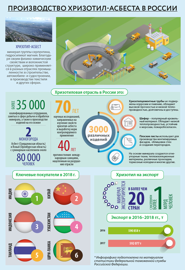 Ключевыми покупателями хризотил-асбеста сегодня являются страны Юго-восточной Азии и Тихоокеанского региона. С Января по ноябрь текущего года, согласно статистике Федеральной таможенной службы, российские предприятия экспортировали около 400 тыс. т хризотил-асбеста. Ключевыми покупателями стали Индия, КНР, Индонезия, Узбекистан и Таиланд. Всего в списке импортеров российского хризотил-асбеста значится больше 20 стран мира.