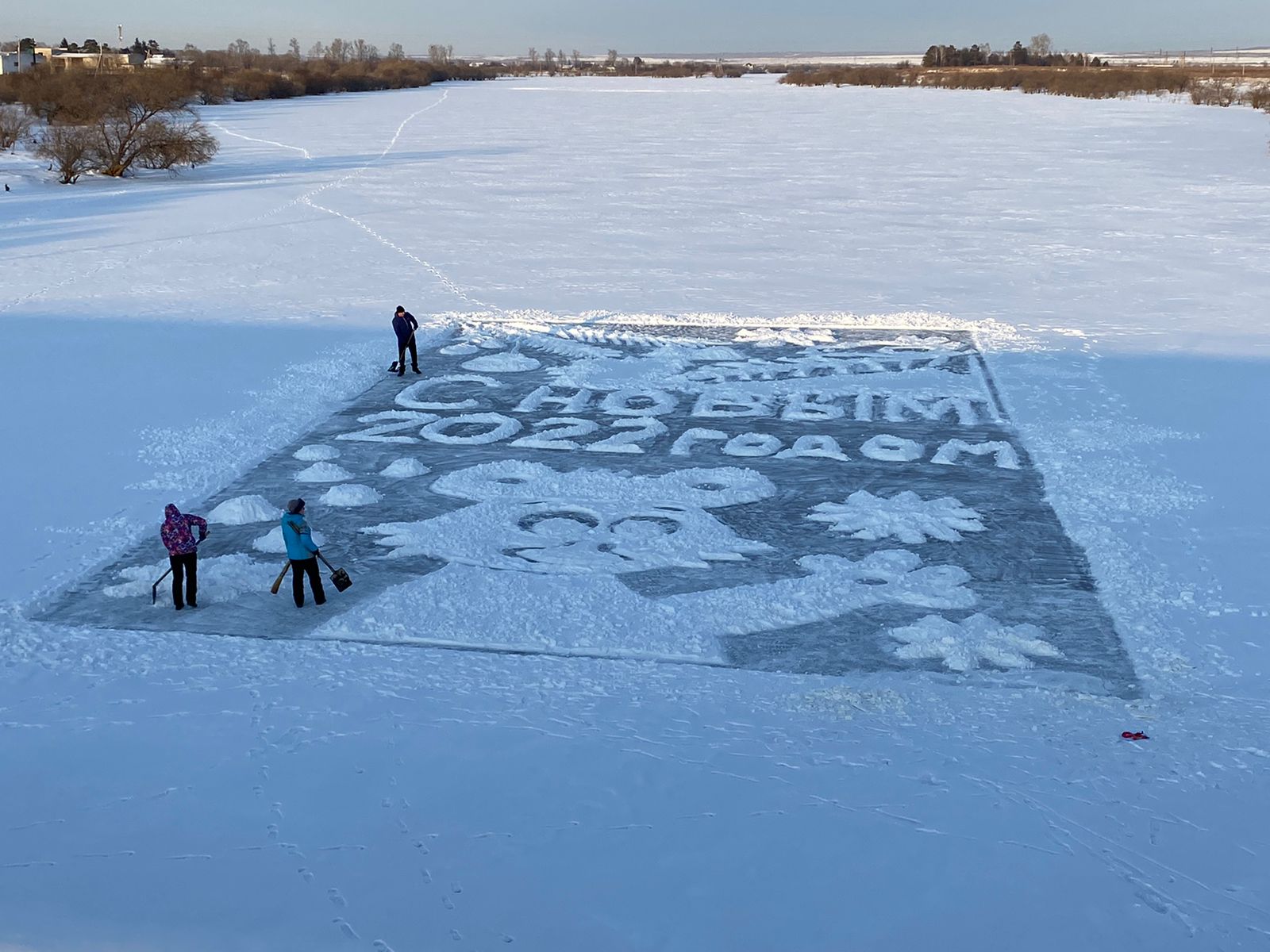 В этом году активисты не смогли проехать к тому озеру, на котором в прошлом рисовали ледовую открытку. Пришлось в срочном порядке менять локацию. Новое озеро оказалось немного меньше прежнего.