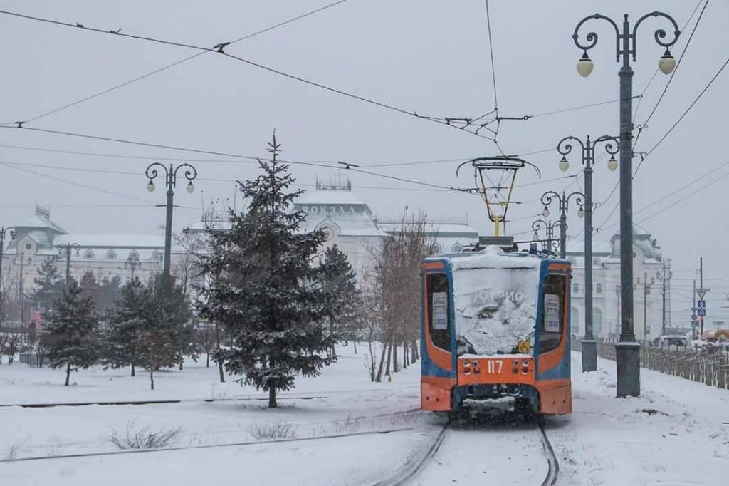 Фото: заснеженный трамвай на ЖД вокзале Хабаровска.