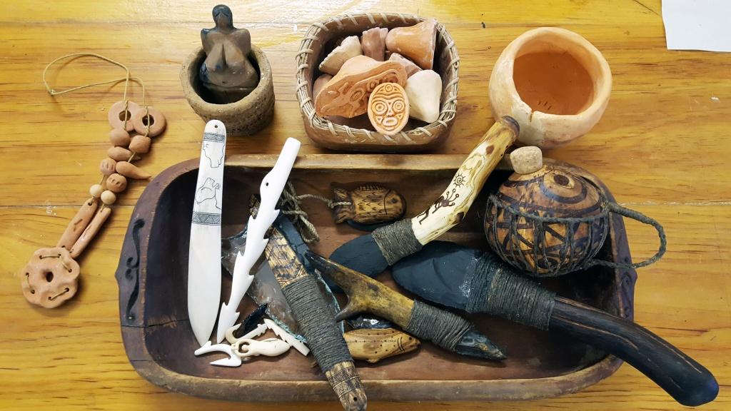Этнографические реплики мастера Николая будто сняты с музейных полок. Брутальные шлифованные ножи и маленькие женские ножи-рыбки, деревянные очки с узкими прорезями, защищавшие эскимосов от слепящего снега, гарпун из кости - всё «подсмотрено» в неолите. Эта эпоха здесь интернациональна. В орнаментации использованы рисунки анасази и хококкам, доколумбового племени из центральной Америки. Отсюда родом и бог плодородия – Кокопели. Носорог – из мадленской культуры (Франция), финал ледникового периода. Фляга из кокоса «взята» у Полинезии. Орнамент Николай наносит кремниевым отщепом. Местных мотивов, например, сикачи-алянских, здесь мало. Амурские петроглифы мастер не воспроизводит, так как из-за большой детализации и ширины линий в миниатюре они сильно теряют в эстетизме.