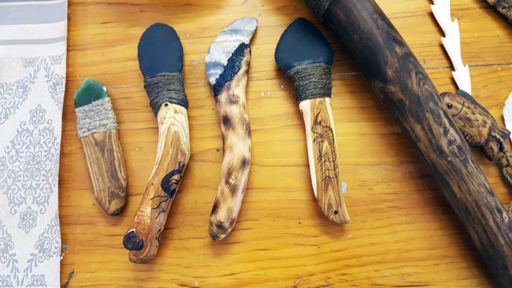 Материал для своих изделий Николай Цой находит в лесу и по берегам рек. В городе камень хоть и на дороге валяется, но для работы не годится: из-за заколачивания свай и работы тяжелой техники трескается базовый грунт, а вместе с ним и камень. За городом хэндмейдер проводит «работу со свидетелями» - показывает образцы, и спрашивают местных, если ли подобное в их районе. Дерево для рукояток ножей – лесное, но подойдет и городское. «Насчет дерева - мне нравится работать с обожженными изделиями. Карбонификация увеличивает срок службы, поверхность превращается в уголь, я ее счищаю, можно кусками песчаника или разбитой керамической кружкой, после обжига уходят неровности, дерево становится тверже. Вообще, я делаю всё, до чего руки доходят. Вполне возможно, что в одной из экспедиций, намеченных на лето, можно попробовать поделать рисунки на туфовых глыбах». «Главное, найти их не в историческом месте!» – вставляет Анастасия. «Да, не спорю», - продолжает Николай. «Если люди приходят и рисуют на этих камнях ключами, это уже о чем-то, да говорит! Туф - материал мягкий, пористый. Плюс крупные зерна, это как рисовать по песчанику.