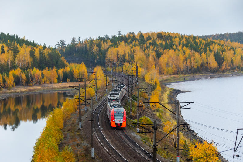Пассажирский поезд «Ласточка», идущий вдоль берега Волчихинского водохранилища на перегоне Флюс-Спортивная Свердловской железной дороги. Фото: ОАО «РЖД»