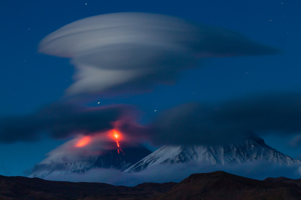 Фото: Денис Будьков. Извержение вулкана Ключевской и лентикулярное облако над его вершиной, 2010 г.