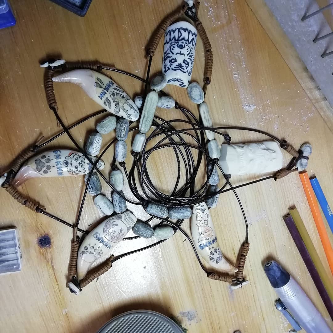Материал для своей работы Юрию добывают местные охотники. Рога изюбра, клыки кабана и кабарги, когти и клыки медведя – это самые крепкие части животных, заряженных на силу и жизненную мощь. Есть материал и с Чукотки – моржовый клык, китовая кость, который можно найти буквально под ногами, на побережьях.