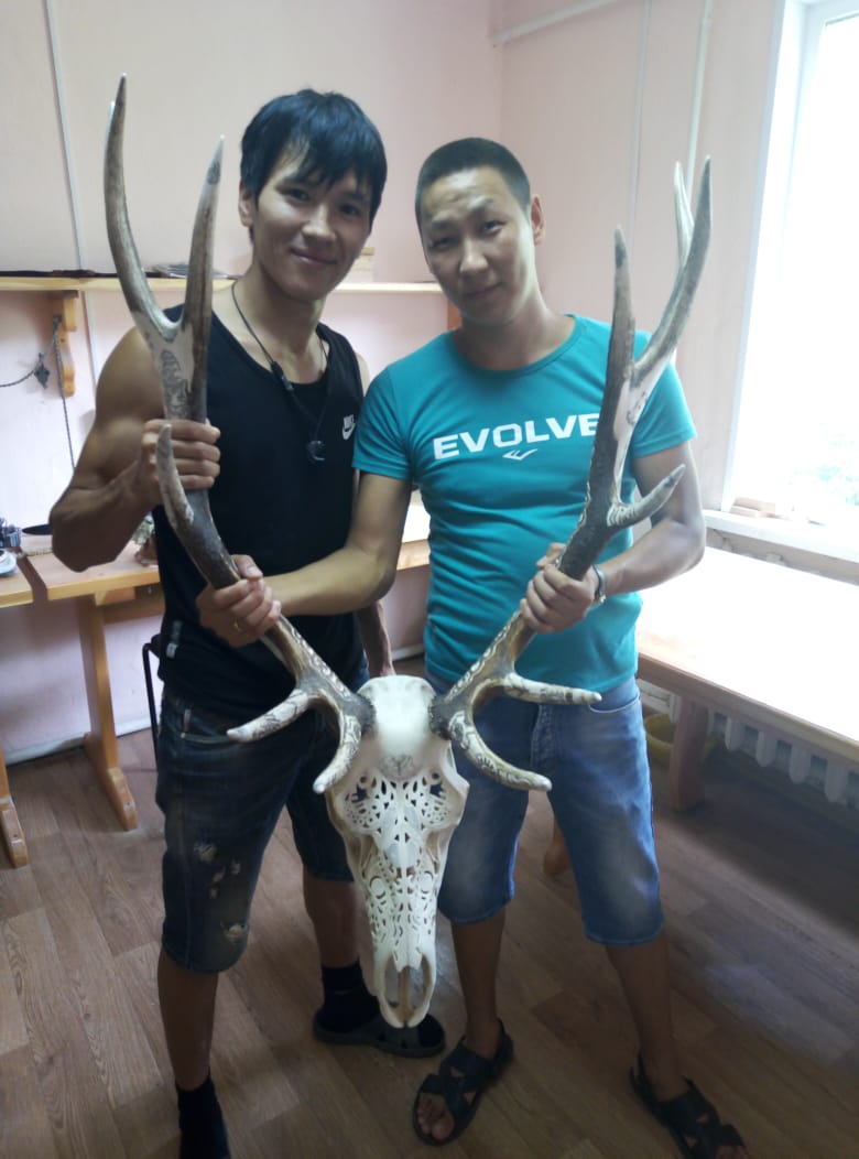 Есть у Юрия и более трудоемкие работы. Например, череп изюбра с ветвистыми рогами, который Юра резал несколько месяцев. На черепе – национальные ажурные узоры, на рогах – изображения молодого мужчины и женщины, животных. Юра поясняет, что он изобразил древнюю удэгейскую легенду о происхождении своего народа. По поверьям этих мест, мужчины произошли от тигра, а женщины – от медведя. Мастер работает в двух техниках: рельефной, когда из цельной кости вырезается объемная фигурка или узор, и в гравировке, с помощью которой на рабочую плоскость наносится рисунок.