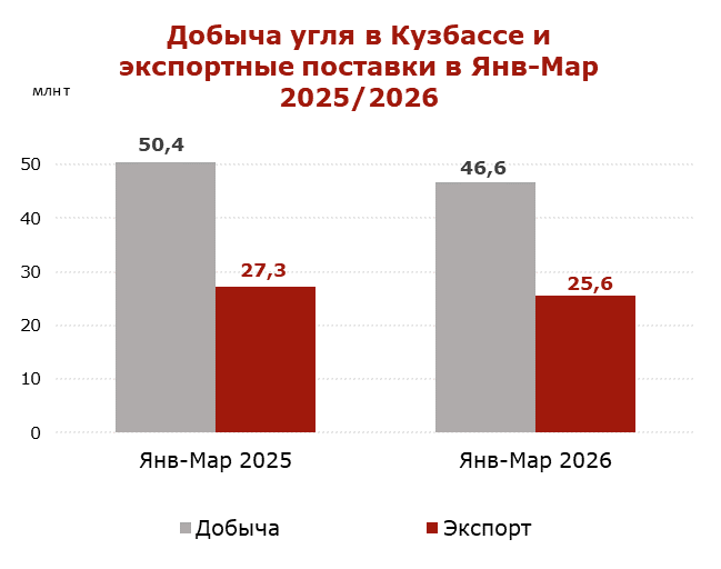 В январе текущего года, однако, объем экспорта дальневосточного угля по ДВЖД снизился на 2,5% относительно показателя соответствующего месяца 2025 г., до 2,4 млн тонн. Основной объем погрузки твердого топлива в январе пришелся на уголь Эльгинского месторождения в Якутии, откуда на экспорт было поставлено 1,6 млн тонн с ростом в 5,1% к январю 2025 г. С Ургальского месторождения в Хабаровском крае в январе было отгружено 645,4 тыс. тонн угля, что на 4,7% больше, чем в январе 2025 г. Остальные поставщики не раскрывали данные за месяц, но спад экспорта может связан с якутскими месторождениями компаний «Колмар» и «Якутуголь» («Мечел»), где уже в прошлом году было зафиксировано снижение производства.