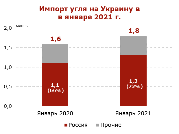 В январе 2021 г. импорт угля на Украину увеличился до 1.80 млн. т. (+0.18 млн. т. или +10% к январю 2020 г.). 1.30 млн. т. или 72% угольного импорта Украины пришлось на Россию, 0.30 млн. т. или 16.5% на США, 0.16 млн. т. или 9% на Казахстан, оставшиеся 2.5% на прочие страны.