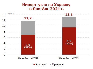 В январе-сентябре 2021 г. объем украинского угольного импорта увеличился до 14.5 млн т. (+1.8 млн т. или +14% по сравнению с аналогичным периодом прошлого года).