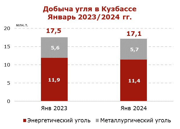 Падение добычи в Кузбассе в 2023 г. до 214.2 млн т. (-9.4 млн т. или -4.2% к 2022 г.) продолжилось в январе 2024 г.