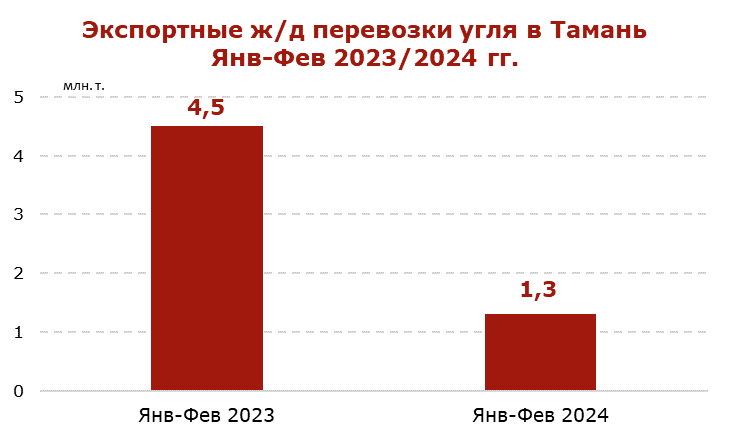 Из-за высоких ставок перевалки на терминале ОТЭКО в Тамани, делающих экспортные поставки угля убыточными, российские добывающие компании не стали подавать ж/д заявки в адрес порта на февраль. Таким образом, экспорт российского угля через указанный порт не будет осуществляться как минимум до марта 2024 г. и экспортные ж/д отгрузки в адрес терминала составят 1.3 млн т. (-3.2 млн т. или -71.1% к январю-февралю 2023 г.).