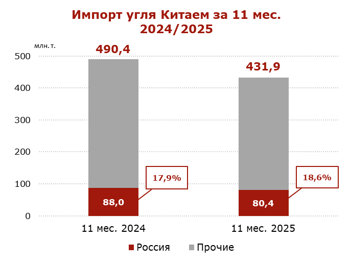 В январе-ноябре 2025 г. экспорт российского угля в Китай опустился до 80.4 млн т. (-7.6 млн т. или -8.6% к январю-ноябрю 2024 г.), по данным Главного таможенного управления КНР (GACC).