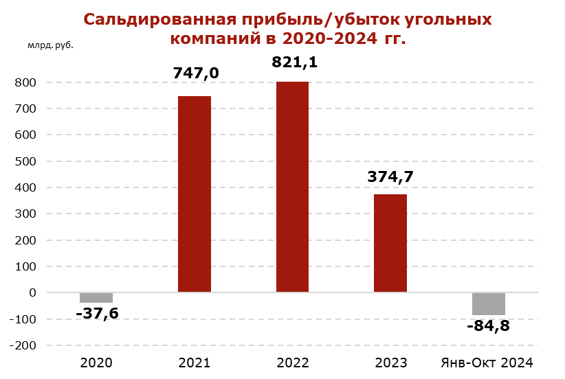 Убытки российских угольных компаний по итогам января-октября 2024 г. подскочили в 4.4 раза до 216.9 млрд. рублей, превысив прибыль, которая составила