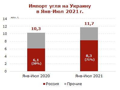 В январе-июле 2021 г. объем украинского угольного импорта увеличился до 11.7 млн т. (+1.4 млн т. или +14% по сравнению с аналогичным периодом прошлого года).