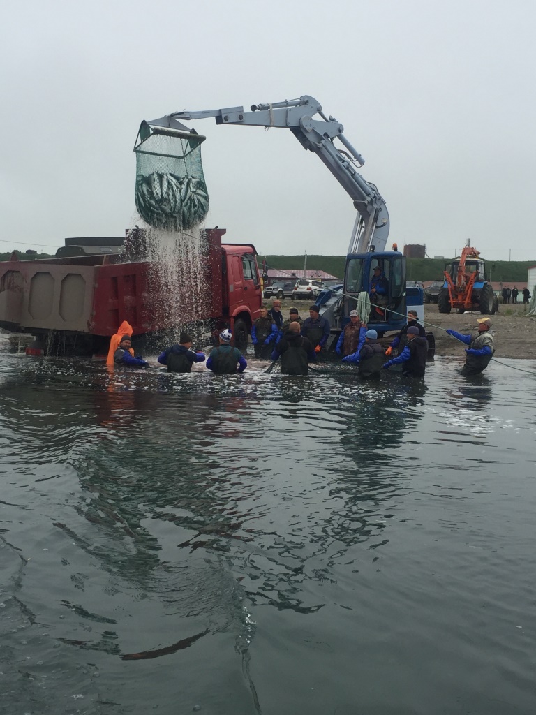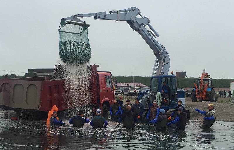 Вытащить улов рыбакам помогает машина. А на другом берегу уже все готово для обработки сырца.