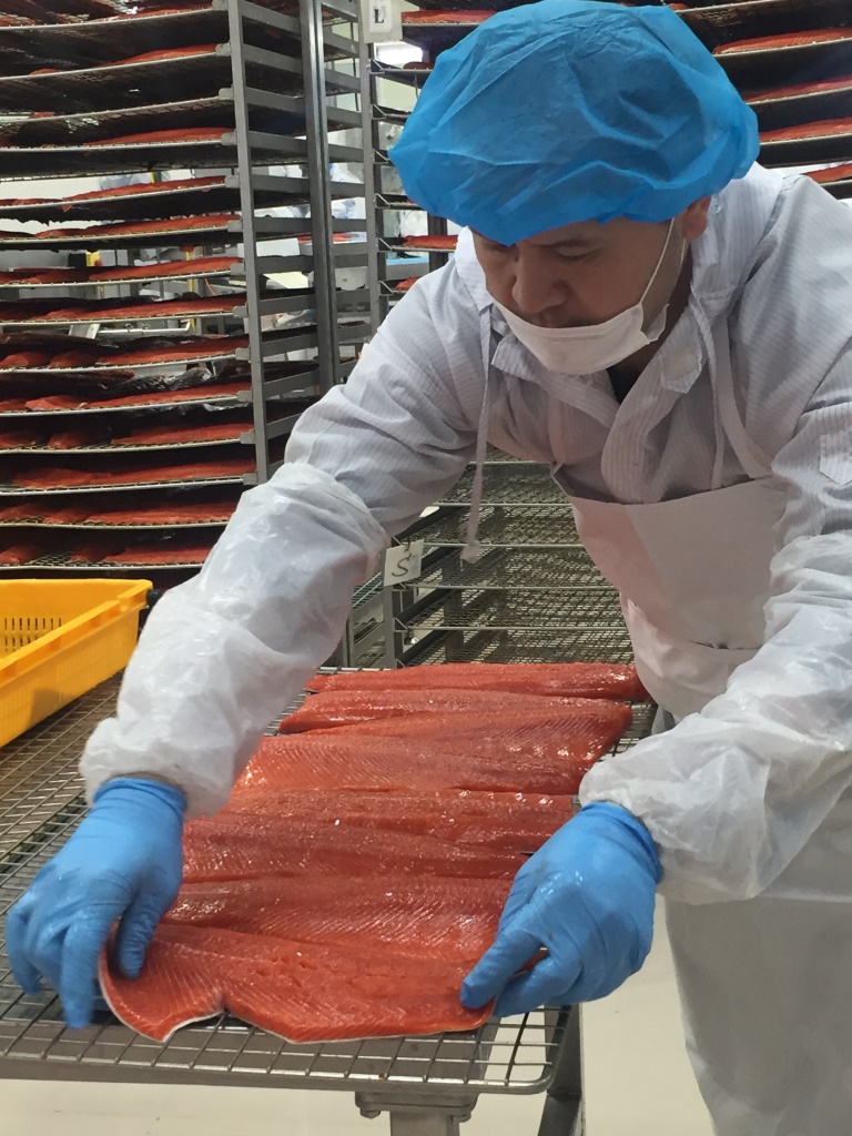 Отобранная для производства филе рыба попадает в морозилку для глазировки. Затем ее солят и коптят в филейном цехе. Производитель уточняет, что для придания аромата используется натуральный дым именно канадского клена. Эта технология исключает наличие в готовом продукте вредных веществ.